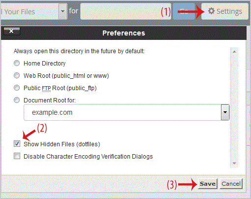 5. If the .htaccess file does not show,. "Settings" babies in the File Manager. You can find the "Settings" babies on the Right Side of the top .. A new small window will open. Mark the "Show Hidden Files (Dotfiles)" option and. "close" babies. You will be able to see the .htaccess file. If it does not exist, create a new one.