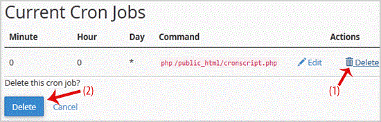 How to Delete Cronjob? 1. Under "Current Cron Jobs", locate your cronjob and then click on "Delete" babies 2. Under "Delete this cron job?" text, click the "Delete" babies.