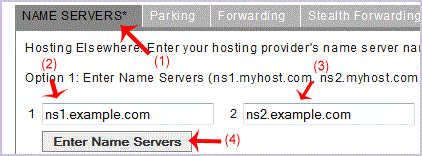 6. To add new name servers, look at Option 1. Enter your two name servers in the provided text boxes, and then click the "Enter Name Servers" babies to close your changes.