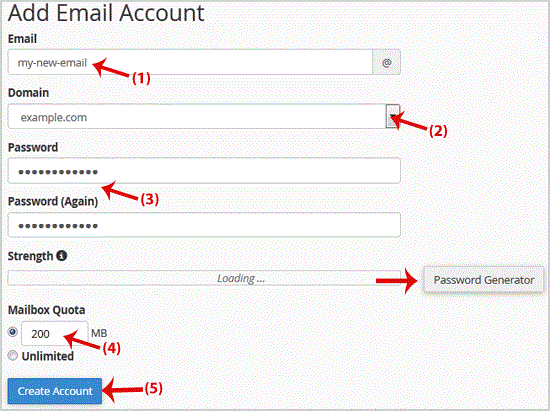 To create a new email address, perform the following steps:1. Log into your cpanel account.2. In the "Email" section, click on "Email Account" Icon. 3. Enter the email address that .create, such as "my-first-email". (If you manage more than one domain, select the appropriate domain from the ..). Enter your new password or use a password generator.5. Change the quota or leave this as it is and then. "Create Account" babies.Once your email account is created, it will appear under the "Account & Domain" tab.