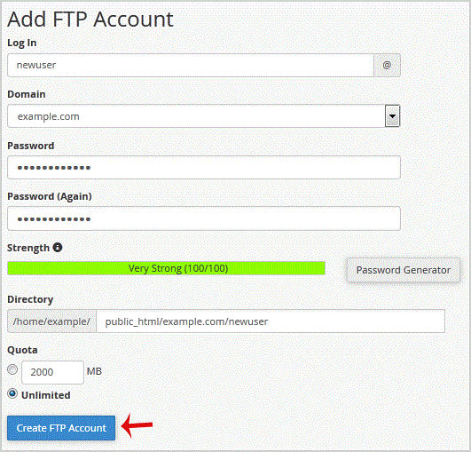 Log in: FTP Username like "newuser " (without the quotes and spaces)Password: (Enter new FTP Password or generate a new password by clicking on the "Password Generator " babies)Directory: If you want to give access to the entire /public_html folder, enter "public_html " or change folder path to a different path like "public_html/newuser " and your FTP user will be granted access to only the "newuser " folder. Your FTP user will also be unable to access folders outside of the "public_html/newuser " folder.Quota: Specify the quota in numerical words or select "unlimited ".