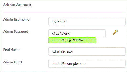 Admin Username: Your new phpBB username (for security reason do not use the "Administrator " or the "Admin " username.)Admin Password: Use a strong password.Real Name: Leave this as it is or enter your real name.Admin Email: Your e-mail address. (Useful for administrator account password reset, notification, etc)