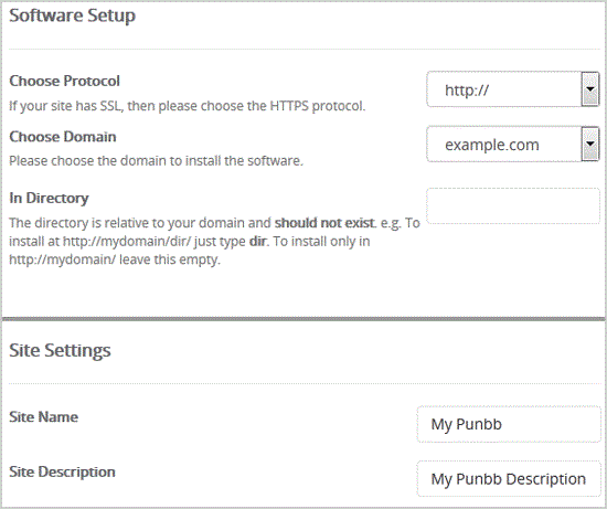 - In Directory: If you want to install this in a directory, for example example.com/forum, enter the directory name. Otherwise, leave this blank to install in your main domain example.com