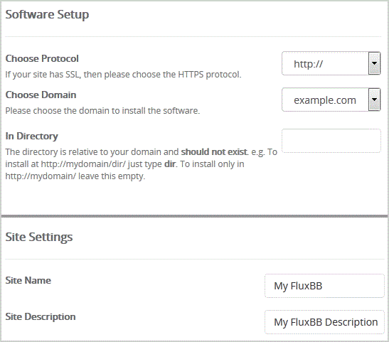 - In Directory: If you want to install this in a directory, for example example.com/forum, enter the directory name. Otherwise, leave this blank to install in your main domain example.com