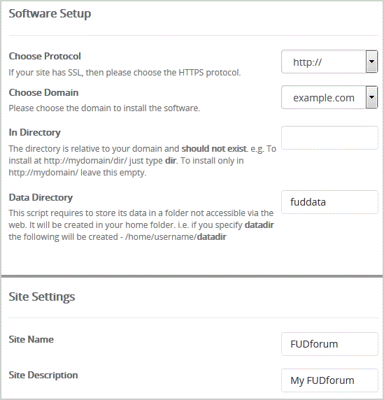 - In Directory: If you want to install this in a directory, for example example.com/forum, enter the directory name. Otherwise, leave this blank to install in your main domain example.com