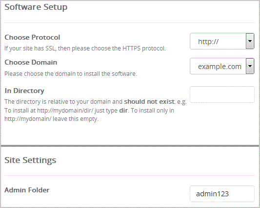 Choose Protocol: You can leave this as it is.Choose Domain: If you don't have multiple domains, leave this as it is.In Directory: If you want to install this in a directory, for example example.com/directory, enter the directory name. Otherwise, leave this blank to install in your main domain example.com