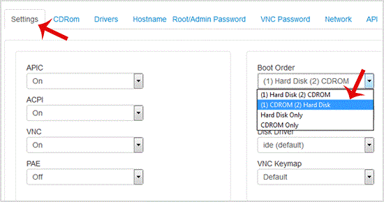 3. Scroll down, and under the "settings" tab, change the Boot Order to "(1) CDROM (2) Hard Disk".