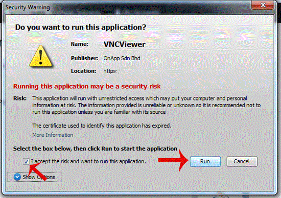 8. It will prompt for confirmation. Click "Ok" or "Continue" and it will show "Security Warning". Accept it and click on "run".