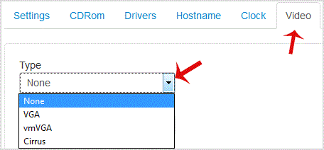 1. Scroll down, and under the"Video" tab, change the type from the drop-down . to the appropriate video type and then reboot your VPS.