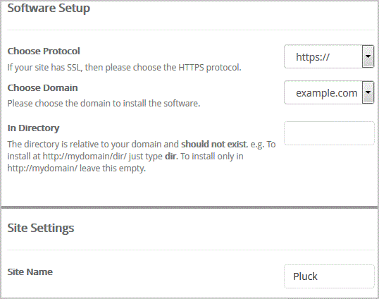 Choose Protocol: You can leave this as it is.Choose Domain: If you don't have multiple domains, leave this as it is.In Directory: If you want to install this in a directory, for example example.com/directory, enter the directory name. Otherwise, leave this blank to install in your main domain example.com