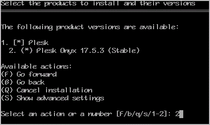 Step 2: Now you can select a version. For Plesk, type 1 and for Plesk Onyx, type 2. Then press enter. Type "F" and press enter again to go to the next option.
