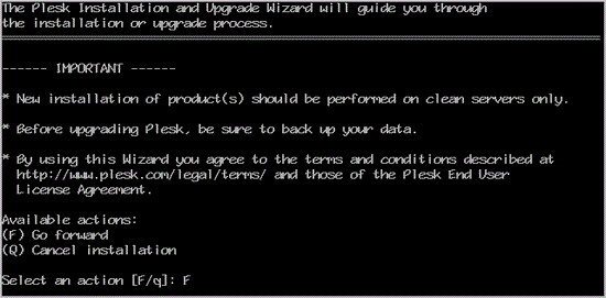 Step 4: Press "F" again. The installation will begin, which can take as long as 20 to 30 minutes. If it shows a hostname-related error, do not quit the installation. Sometimes Plesk only shows warnings and provides you with an instruction of how to fix your problem.