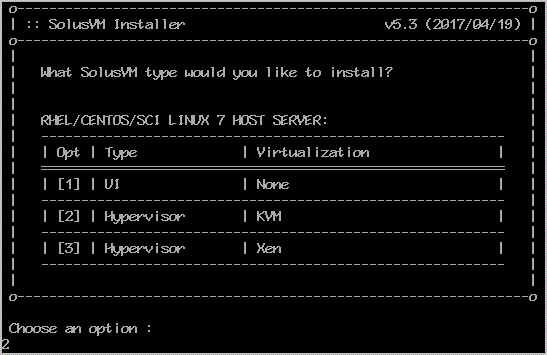 Then it will show you an option to choose virtualization. Most people prefer KVM and others Xen. Select your preferred virtualization by typing 1 or 2 and then press Enter. For KVM, we enter 2 and then hit Enter.